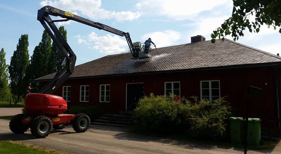 Högtryckstvätt av alla skiffertaken vid Nedre Ulleruds kyrka. Efterbehandling med mossbekämpningsmedel.